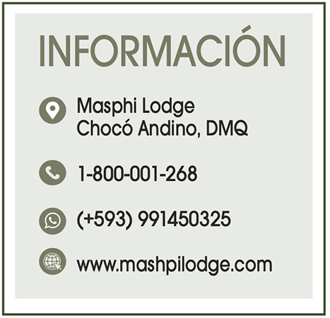La operación de Mashpi Lodge es carbono neutro, permitiendo a los exploradores contribuir a la mitigación del cambio climático. La compensación de la huella de carbono se realiza directamente en el territorio de la reserva. Invitamos a todos los ecuatorianos y residentes a que conozcan y aprecien la importancia de esta fascinante franja verde, llena de vida, luz y energía, ubicada cerca de Quito. Mashpi Lodge ofrece una inmersión profunda en el bosque, logra una conexión íntima con la naturaleza, las actividades al aire libre al ritmo de cada uno resultan en un bienestar completo y transformador.