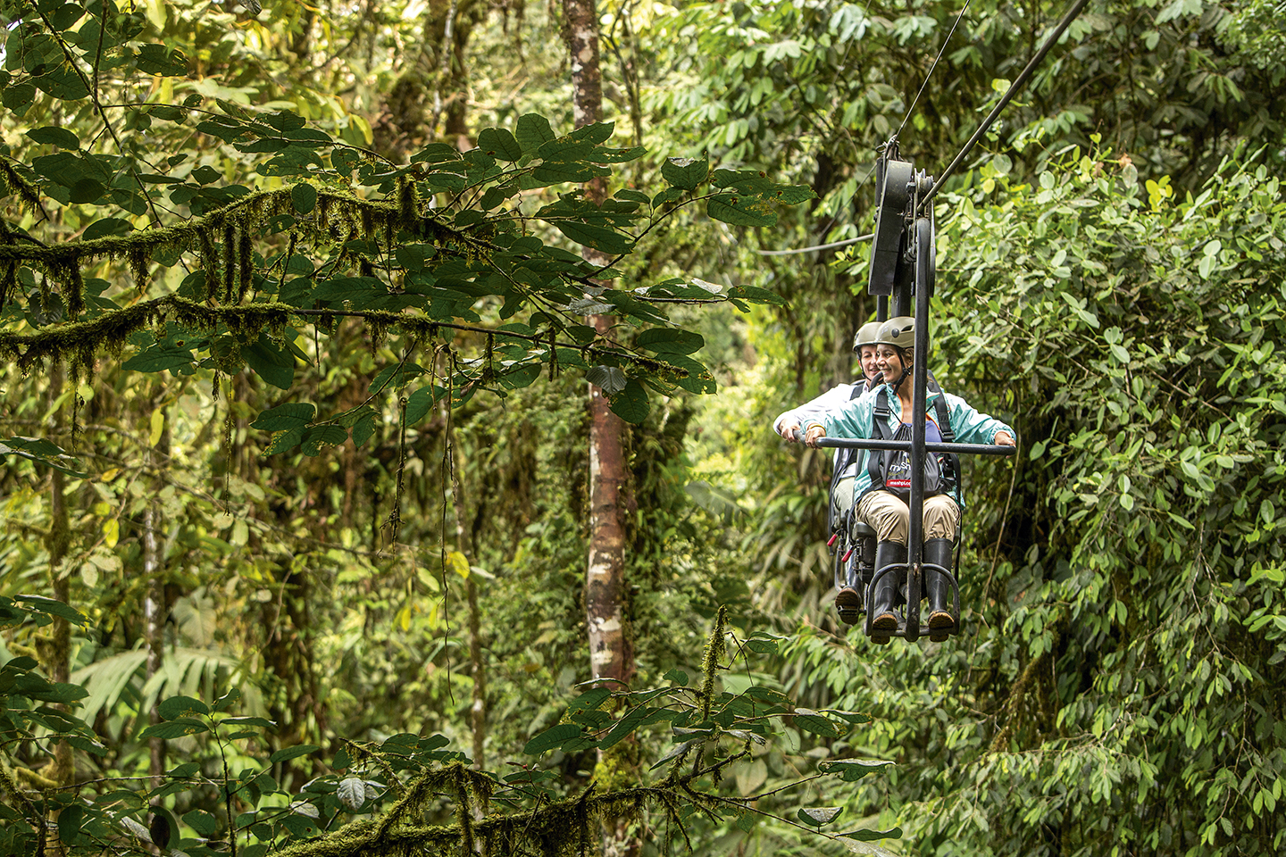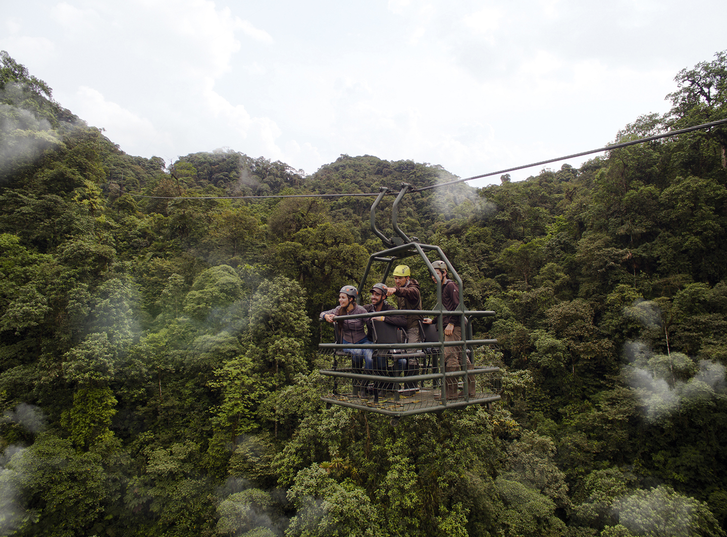 There are many ways to discover the wonders of Mashpi Lodge. By foot, feeling the earth and water with your hands, or by air, from a bird’s eye view. Swing from the vines like Tarzan or marvel at Mashpi’s indescribable landscapes from above. Would your kid believe you if you told him or her that you are going for a ride on bicycle that flies? Well, here, air transportation is not something that happens only in a Harry Potter book. Mashpi’s Sky Bike is designed for two people to roll comfortably as one of them pedals a distance of 200 m (0.1 mi) – safely crossing through cliffs and the jungle at the tip of your fingers. Or float atop the canopy aboard the Dragonfly, the most advanced cable car in the region, that glides over the forest for a distance of 2 km (1.2 mi). Look at the jungle with the freedom of a bird and feel as life unfolds beneath your feet.