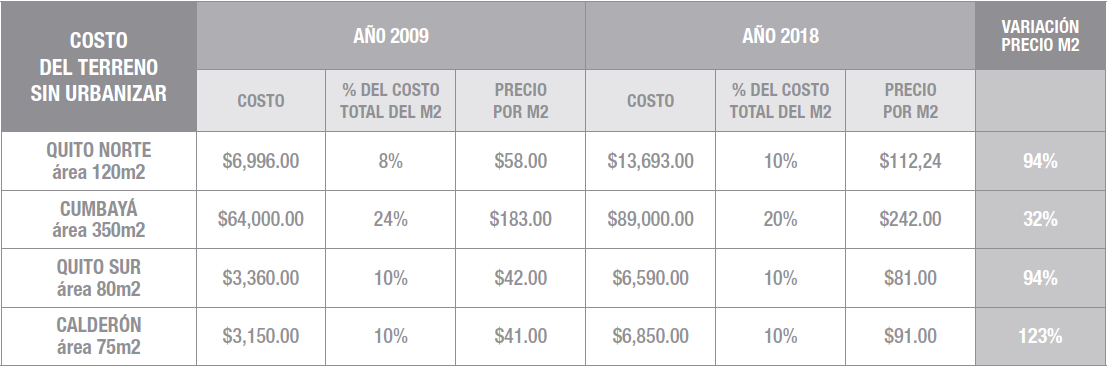 Y por ahí empezamos el análisis. En el cuadro No. 1 expresamos la variación en el costo del terreno entre los años 2009 y 2018, en las cuatro ubicaciones mencionadas.