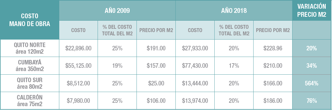 Planificar detenidamente es parte de las buenas prácticas corporativas, y no hacerlo decanta en un problema mayor. “El estancamiento de un proyecto produce gastos innecesarios y un mayor monto de inversión en mano de obra”, nos dice Mauricio hijo. Pero más allá del estancamiento en el proceso, debemos considerar que la normativa laboral implementada durante los últimos años, más los incrementos de sueldo decretados por ley, han convertido a este rubro en uno de los más delicados en el proceso constructivo. En el Cuadro No. 4 está el detalle de la variación del precio de mano de obra y su injerencia en el costo final.