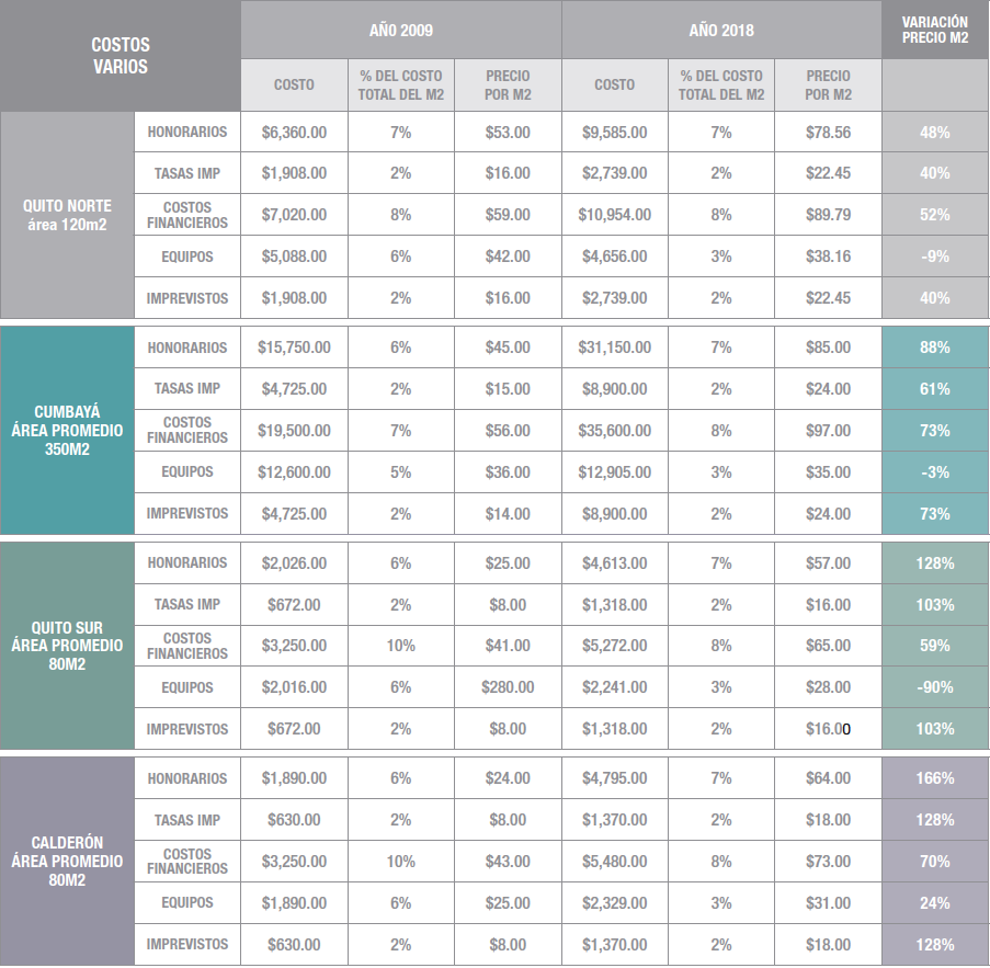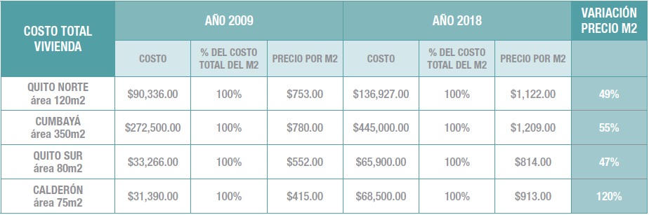 En este análisis incluimos sendos cuadros para entender la evolución de precios en los distintos rubros involucrados en la construcción de vivienda durante los últimos años. En ellos consta información del año 2009 que fue publicada en la edición No. 26 de CLAVE, como parte de una entrevista con el Ing. Carlos Holguín; y los valores actualizados a 2018 gracias a la colaboración de los ingenieros Martínez.