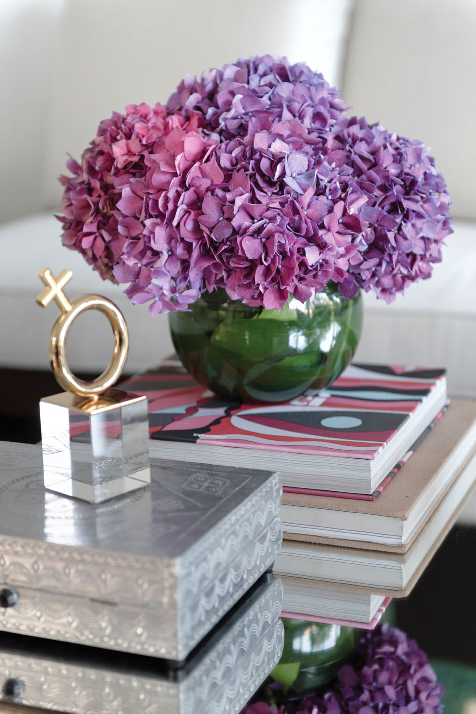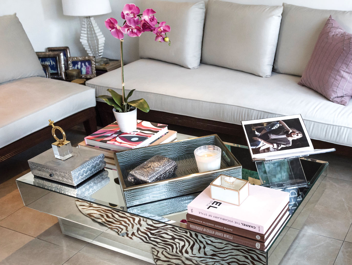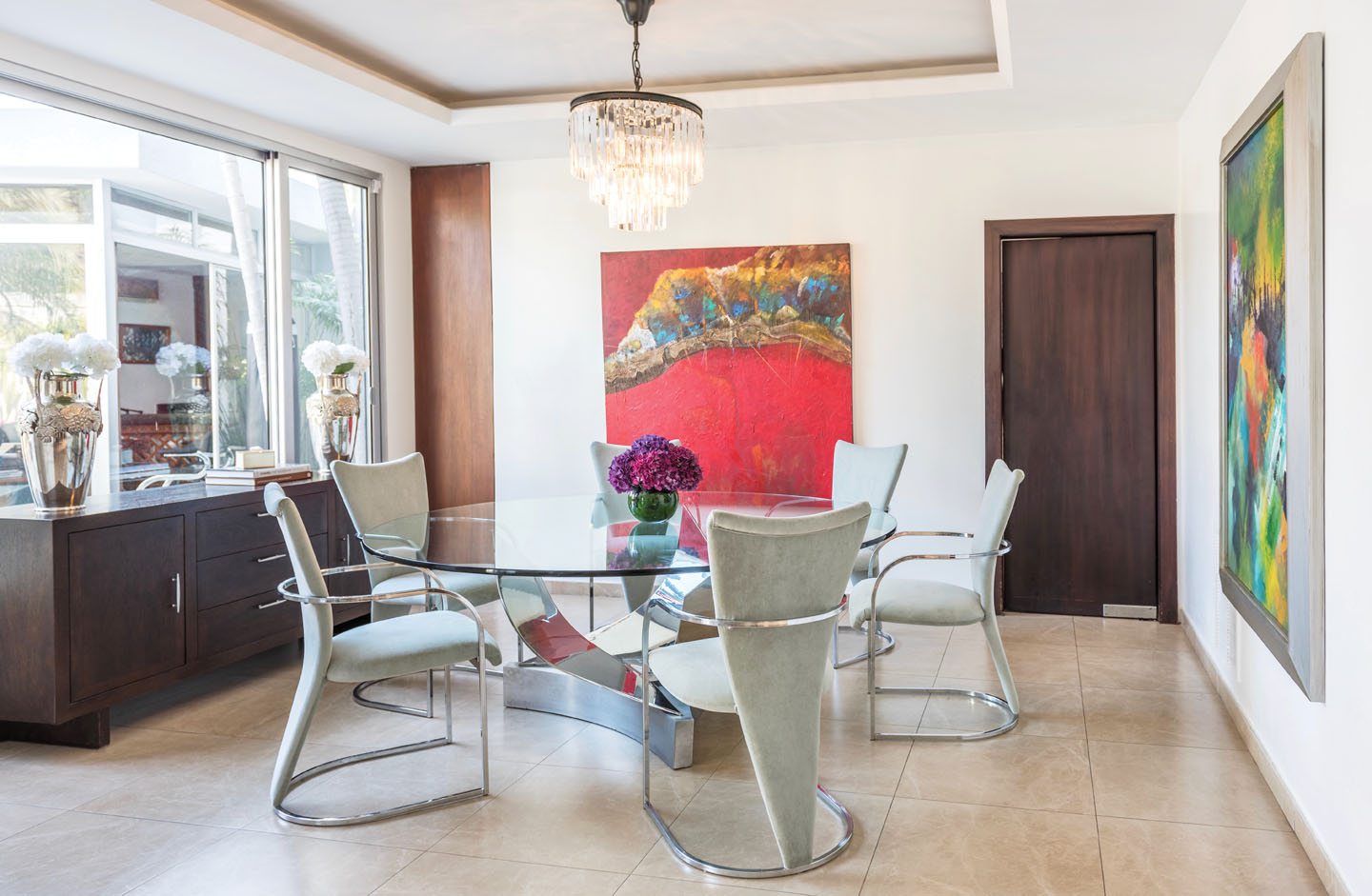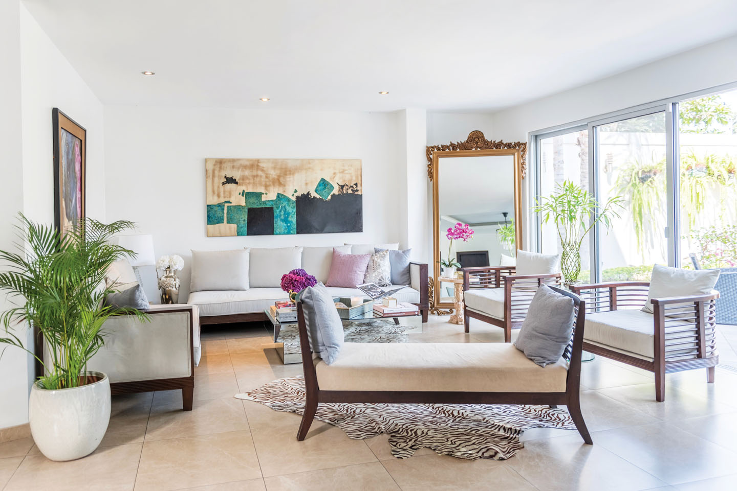 En la decoración resaltan varios elementos de plata, que según sus propias palabras, dan elegancia a cualquier rincón. Y así, los objetos plateados que ha distribuido en su hogar dan un aire de glamur a cada paso. Sin embargo, considera que son las flores la clave para crear ambientes acogedores. Su lugar preferido es la sala, y en ella suele disfrutar de un buen vino y de música junto a sus seres queridos.