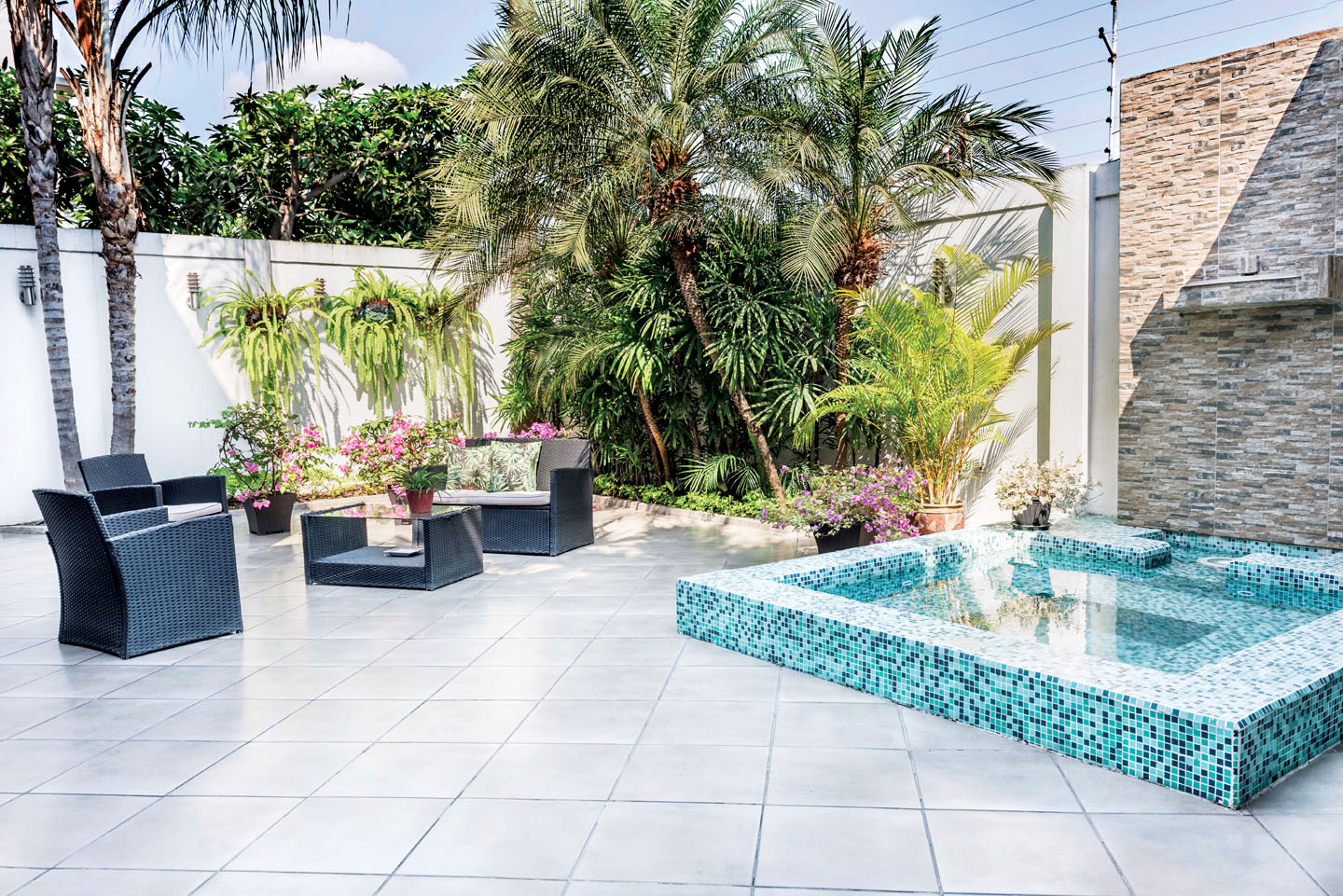 Los muebles de la sala y el comedor son blancos y están combinados con cojines color pastel, aunque este estilo es contrastado con la fuerza de los colores de las obras de arte en gran formato que Melissa eligió. La sala tiene una puerta directa al patio, en donde se disfruta de un pequeño jardín, una sala de ratán y un jacuzzi perfectamente distribuidos para dejar un espacio vacío muy útil en cualquier reunión social. “Siempre he tenido muy claro cómo me gustan los espacios en mi hogar, así que junto a mi esposo –a quien también le encanta decorar- hicimos esta casa. Fue una experiencia linda que compartimos”, comentó.