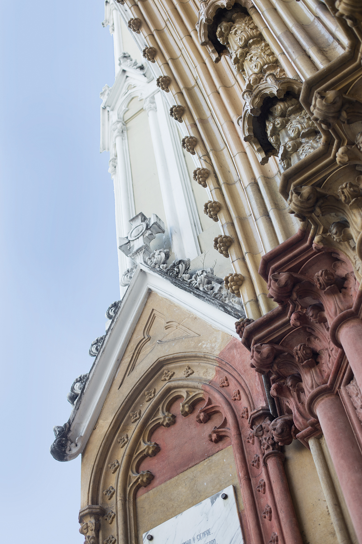 A little further back and above, we can distinguish the statue of the Apostle James the Great. Towards the middle is a stained glass window, in the shape of a rosette, whose colored glasses filter the interior light to create a multihued atmosphere. As we cross the street and approach the entrance, we pass under a pointed arch on whose lower level we notice five bas-reliefs, a bull, an angel, an eagle, a lion and a book.