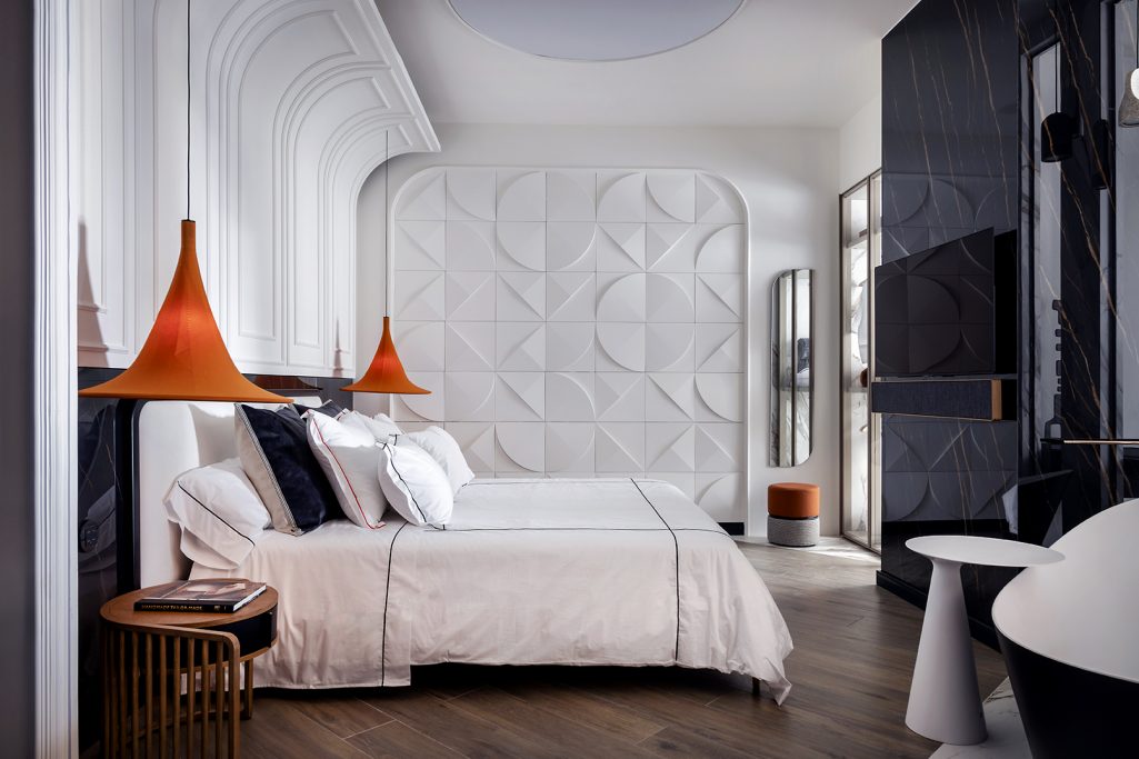 Sorprendió la recurrencia de los tonos naranjas y rojos. Los tonos cálidos regresan con fuerza y se impregnan no solo en mueblería, sino también en paredes, lámparas y cortinas. Estos tonos realzan la personalidad de los espacios y los transitan a una expresión más álgida del diseño y la decoración de interiores.