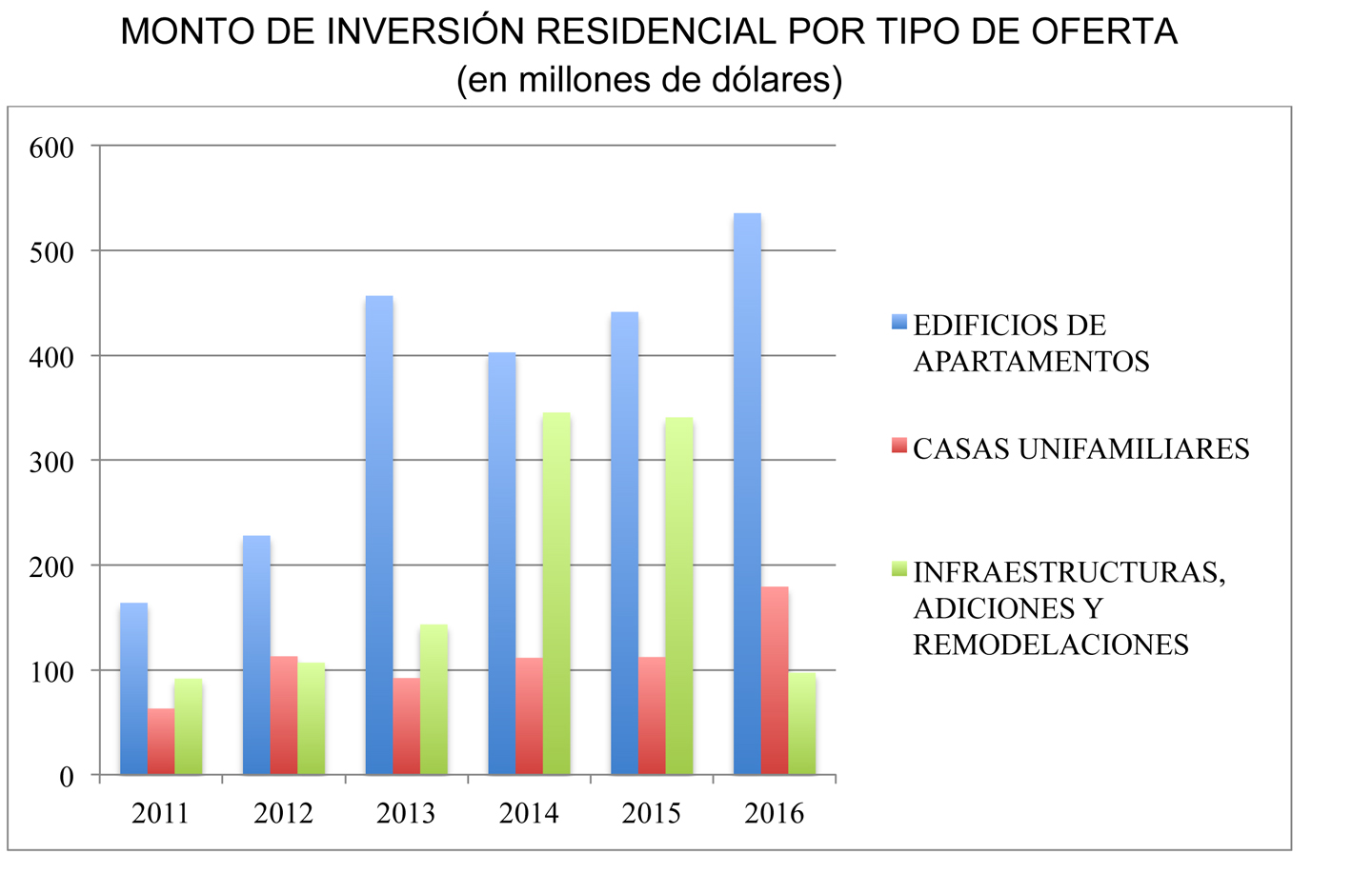 Los proyectos residenciales presentaron montos de inversión ascendentes desde 2011 hasta 2015, pero experimentan un descenso en 2016. Durante estos años, la inversión hecha en proyectos de edificios de apartamentos es tres veces más alta que el dinero destinado a proyectos de casas unifamiliares, tal como se aprecia en el Cuadro No 3.