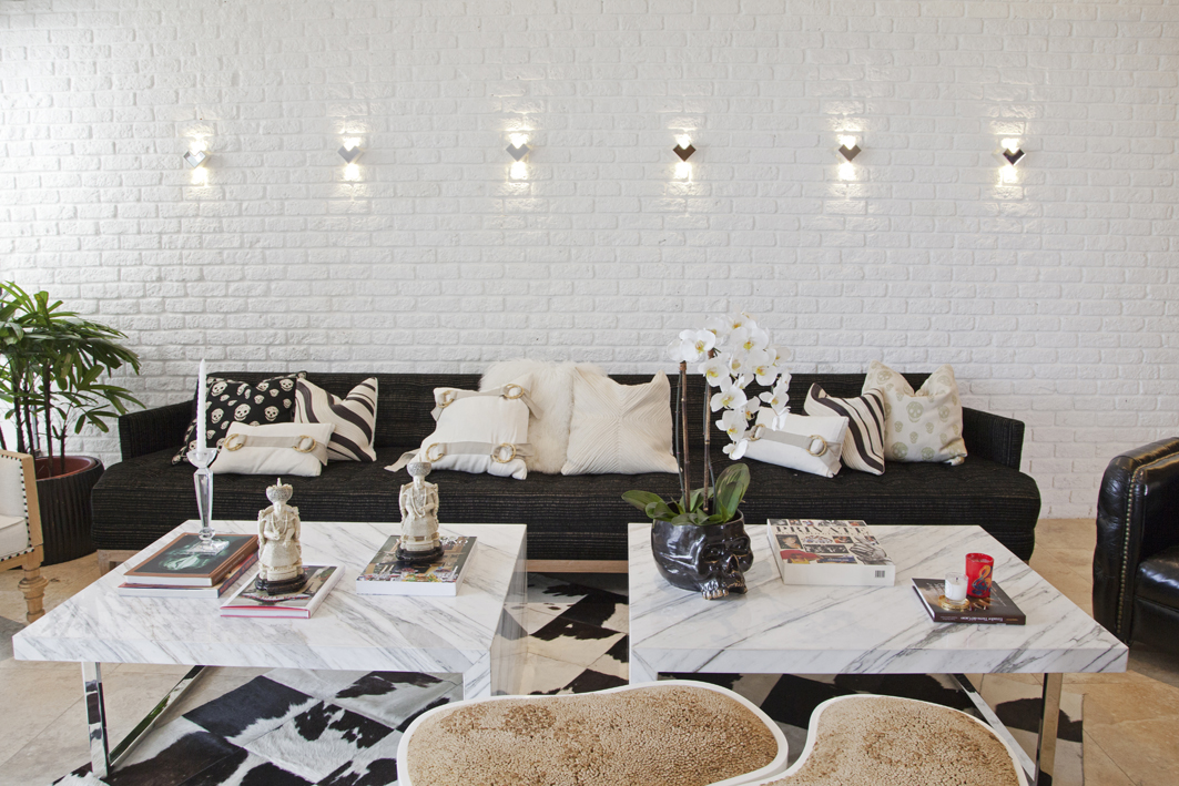Su decoración es de estilo ecléctico, mezcla muebles clásicos y de mediados del siglo pasado, utilizando accesorios, telas y almohadones de una manera única y original. Como se habrán dado cuenta, hay un gusto especial por las calaveras que son encontradas en una lámpara, almohadones, alfombra y varios adornos. Un acierto en la decoración, por ejemplo, son los accesorios y el sofá de Jonathan Adler.