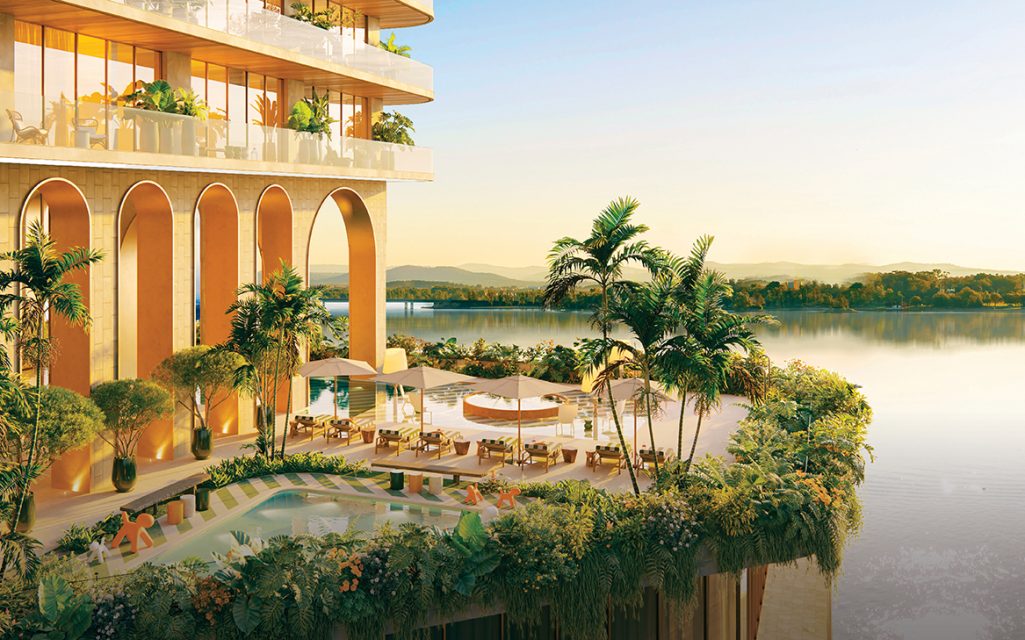 La energía de la que habló Philipe fluye a través de distintos elementos. Entre ellos, la naturaleza tropical que viste el proyecto, el techo de la piscina que está inspirado en los reflejos del color del cielo durante el atardecer, y las suaves curvas de los arcos que acogen en armonía cada espacio. Llama la atención que los volúmenes de los ascensores se distribuyen en dos plantas y se convierten en el elemento escultórico de la terraza, que estarán cubiertos en acabado de “pan de oro”.