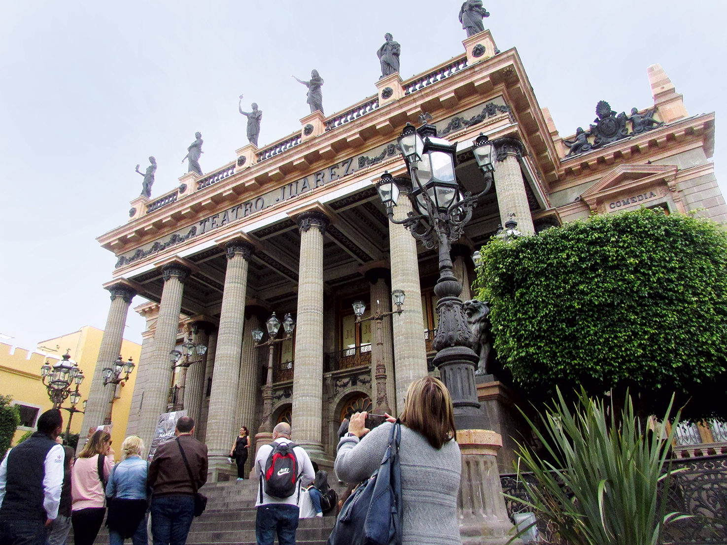 Llegamos al Teatro Juárez, construido durante el mandato de Porfirio Díaz e inaugurado en 1903, época conocida como el porfiriato. Esta joya arquitectónica refleja un estilo ecléctico, con características de culturas europeas y asiáticas. La parte frontal es decorada con columnas dórico-romanas, y en sus capiteles se aprecian liras y máscaras teatrales. Uno de los aspectos más sobresalientes es la parte superior del pórtico, donde se distinguen estatuas de musas griegas.