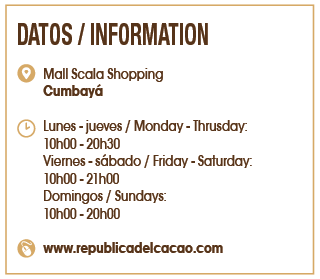 Le esperamos en la nueva Chocolate Boutique de República del Cacao en el Scala Shoppping. Los sabores y aromas de los postres y bombones del Taller del Cacao le transportarán al campo en donde crece el Cacao Fino, y además usted sentirá la satisfacción de ser parte de una comunidad muy especial, ese gran grupo de personas conscientes de la importancia de proteger un tesoro: el Cacao Fino en su origen.