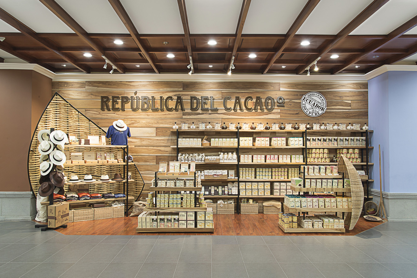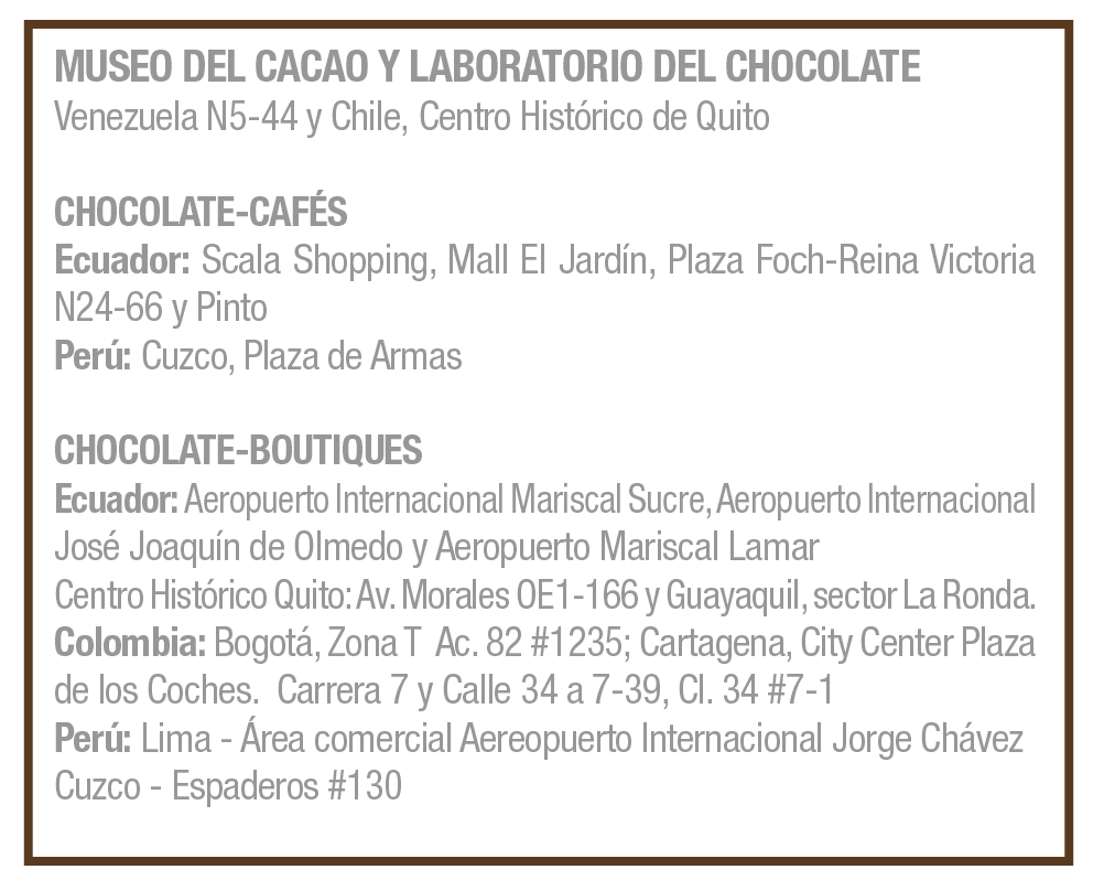 Al entrar a la Chocolate-Boutique de la marca en el Centro de Quito, a pocos pasos de la Plaza Grande, uno se encuentra inmerso en esta experiencia casi de inmediato. Atrás queda el ruido de la gente y uno se encuentra envuelto por un delicioso aroma a chocolate, las paredes cubiertas de Laurel e imágenes de las plantaciones que producen Cacao Fino le indican que ha entrado a un mundo aparte.
