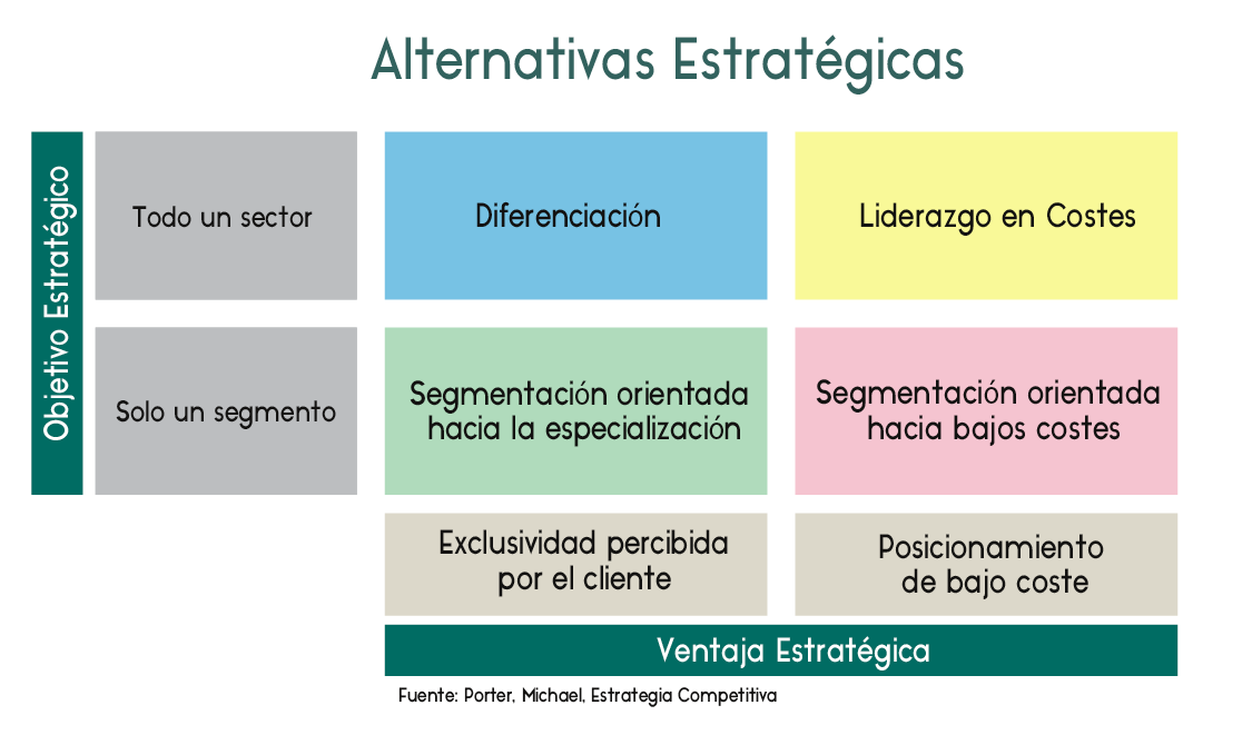Desde esta perspectiva, toda compañía puede desenvolverse mejor que sus competidores si se centra en uno de estos tres planteamientos: liderazgo en costes, diferenciación o segmentación. La primera alternativa consiste en vender los productos elaborados por la empresa a precios bajos, por lo que todos sus esfuerzos de gestión han de focalizarse en el control de los costes. Las firmas dedicadas a la construcción y comercialización de vivienda social son un buen ejemplo de esta elección estratégica. Por el contrario, la diferenciación conlleva que la compañía ofrezca productos que el mercado (los clientes) perciba como únicos. Ejemplo de ellas son las promotoras que impulsan proyectos singulares, diseñados por arquitectos nacionales e internacionales de gran renombre.