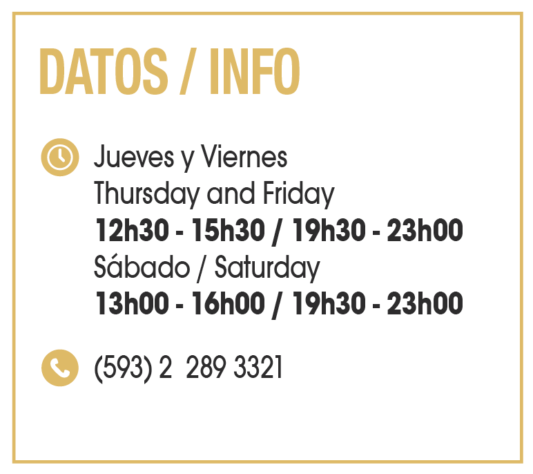 El factor sorpresa es el leitmotiv de la presencia de los comensales en este establecimiento, donde los colores no se quedan atrás. El chef hace referencia a que Ecuador es un país lleno de luz y paisajes que enamoran fácilmente. La ventaja de estar en el centro del mundo le hace gozar de frutos y verduras de colores vistosos y de sabores sanos. La tierra será una constante en sus creaciones, y la intensidad de sus tonos será imprescindible para disfrutar de la comida y la bebida que allí se ofrece.