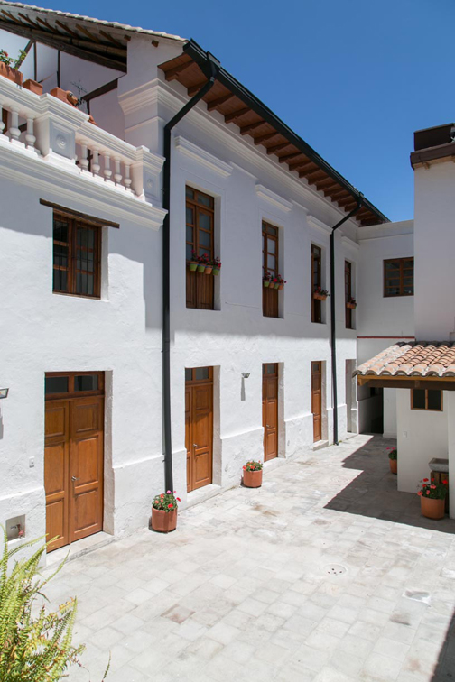 Al ingresar por la calle García Moreno se observa un primer patio que claramente actúa como núcleo central para la distribución de los espacios. Su forma rectangular se apoya sobre columnas rectangulares de tendencia dórica en sus cuatro lados, llama la atención el piso de cerámica ajedrezada en el patio, y cerámica policroma tipo mosaico en los corredores perimetrales. Avanzando hacia la parte posterior se encuentra un patio, las bóvedas y muros de contención.