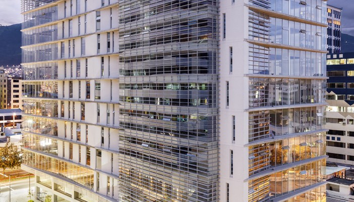 El reto de insertar un edificio de carácter corporativo dentro de una zona consolidada de la ciudad exige identificar rasgos implícitos en el contexto tales como: el espacio público, la escala, la heterogeneidad de los recursos arquitectónicos en los edificios circundantes, el paisaje natural y sus visuales, etc. El edificio Titanium acoge estas condicionantes y las resume en el uso de dos recursos básicos de composición: el pliegue y los pixeles; el primero soluciona el problema de la “escala”, ya que la exigencia de ocupación en la rentabilidad inmobiliaria obliga generalmente a volúmenes masivos y agresivos, sin embargo, Titanium pliega sus fachadas y crea una percepción visual de subdivisión de la masa. La subdivisión en pixeles de la fachada resuelve el problema de integración a un contexto en extremo heterogéneo, permitiendo libertad en el juego de vanos y llenos sin afectar al resultado final de la composición. La materialidad del edificio es sencilla; hormigón a la vista, vidrio transparente, aluminio natural y mampostería pintada de blanco, sumados a la geometría básica del edificio, conforman un todo que no pretende más que insertarse discretamente y sin ornamentos a este importante centro financiero de la ciudad. Adicionalmente se crea una generosa plaza que rodea el edificio en tres frentes, devolviendo al peatón su protagonismo dentro del medio urbano.