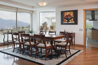 La casa se caracteriza por su luminosidad, áreas sociales amplias y jardines con vistas magníficas al valle de Cumbayá. Los colores tierra y blancos asumen el protagonismo en la decoración; y la cocina, uno de los lugares que Nicole más disfruta, nos acoge con su amplia distribución y la calidez que brinda la salida a una terraza, que se convierte en cómplice del impactante paisaje que se dibuja en sus ventanas. Sin duda este espacio está pensado para compartir con familia y amigos.