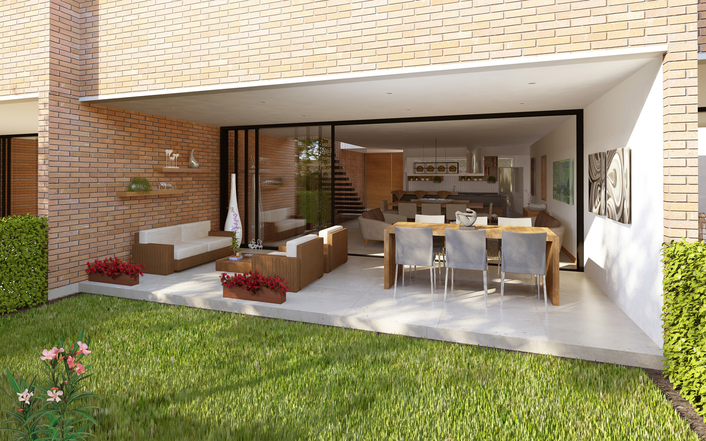 La fachada es de ladrillo, material muy noble que es atemporal, no se deteriora y tampoco requiere mantenimiento, es moderno y muy cálido. La arquitectura es contemporánea, y resaltan materiales como madera, ladrillo, metal, marcos de aluminio en las ventanas, mesones de cocina y baños de granito. Los espacios interiores son integrados, totalmente abiertos, sin ninguna columna que estorbe o provoque interrupciones visuales.