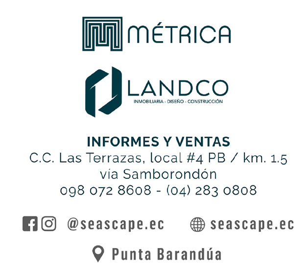 Se trata de Seascape, la novedad en el portafolio de proyectos de Métrica, promotora inmobiliaria de gran prestigio que ha sorprendido estos últimos años con proyectos de la categoría de Arcos Plaza y Blue Bay, entre muchos otros; y en alianza con la promotora constructora Landco, importantes proyectos como Manglero Vista, Manglero Two, Town Plaza, por mencionar algunos. Pero la verdadera noticia que traen estas páginas es que se trata de un proyecto en la mejor playa ecuatoriana, es único, exclusivo, y cuenta con elementos diferenciadores que lo posicionan a otra escala.