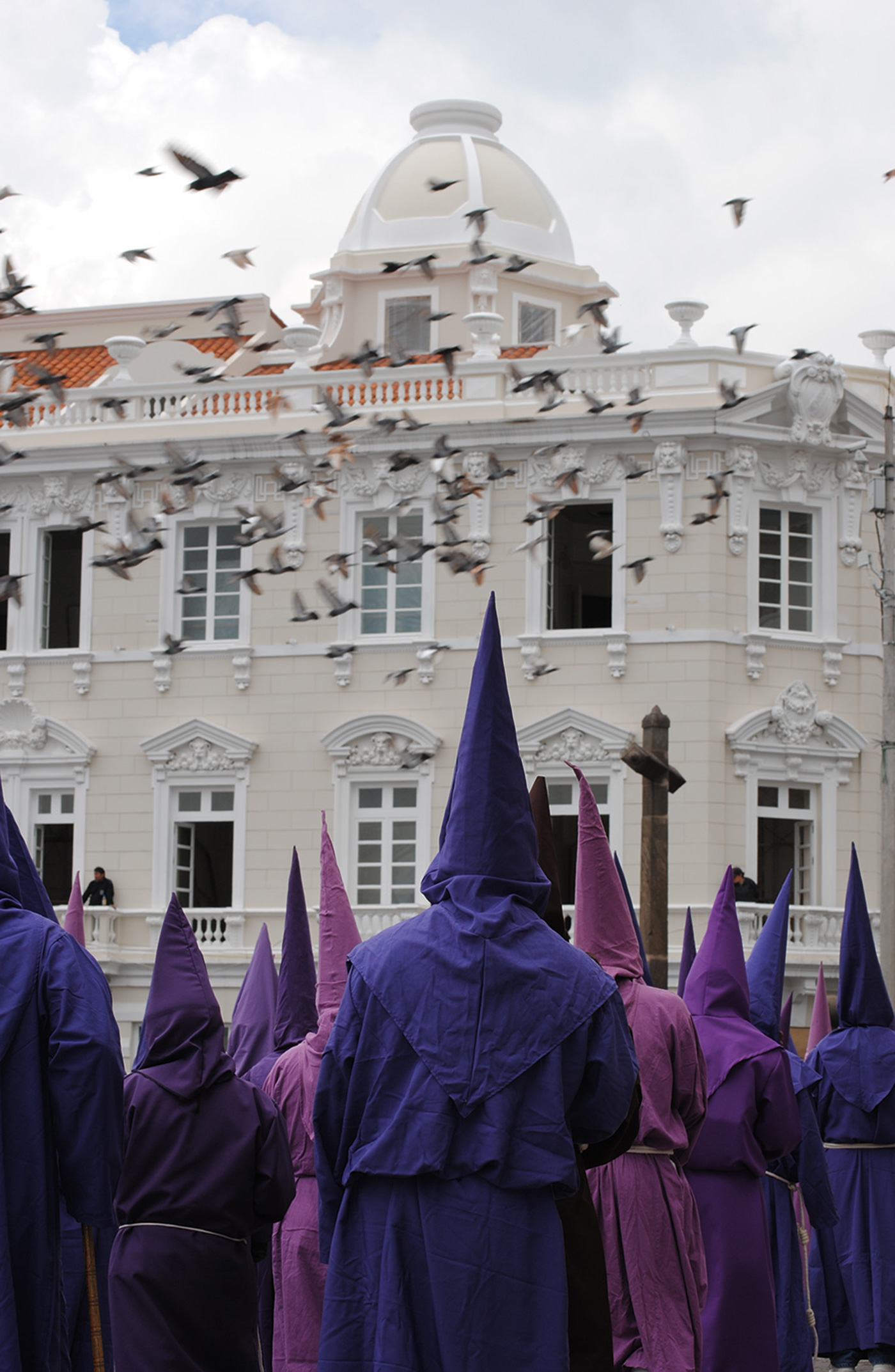 La celebración de Semana Santa en Quito es una de ellas. La ciudad recibe a muchos visitantes para ser testigos de la fe y creencias de esta noble tradición. Los devotos participan por amor, temor o fervor; y junto a la imagen de Jesús del Gran Poder – patrono de Quito – protagonizan un recorrido imponente entre iglesias, casas coloniales y calles que se pintan del morado de la ropa de los cucuruchos y verónicas que recuerdan el milagro del “Manto de Verónica de la Santa Faz”.