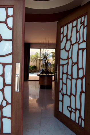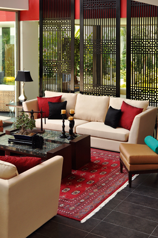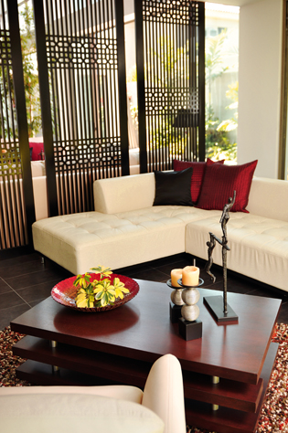 Estas imágenes muestran un proyecto residencial contemporáneo, de estilo oriental. El protagonista de las áreas es el biombo, diseñado a doble altura, como separador de ambientes entre sala formal y sala de estar. La vegetación interior incorpora el concepto oriental, al contrastar colores propios de esta cultura en una versión única y actual.