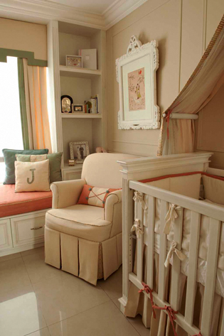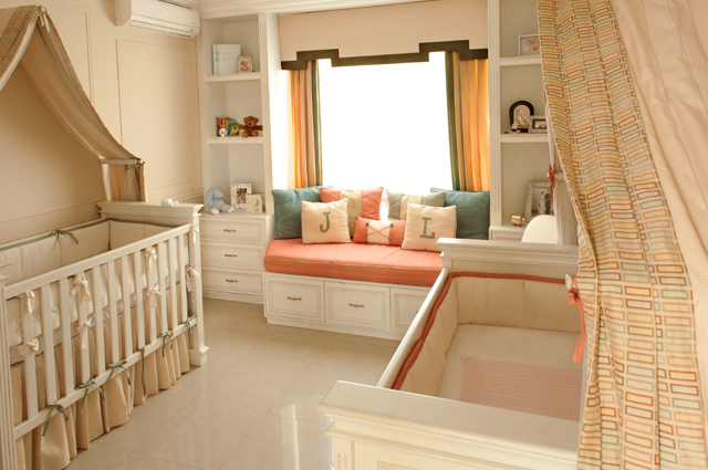 Ambientes muy especiales, y muchas veces difíciles de aprovechar, son los dormitorios de niños y bebés, como éste, diseñado para una pareja de mellizos. En un espacio pequeño logré crear un ambiente clásico y sofisticado, sin perder la esencia y dulzura propia de un dormitorio de bebés. Las piezas tienen detalles clave: muebles empotrados, cornisas, molduras, telas que brindan elegancia y personalizan detalles.