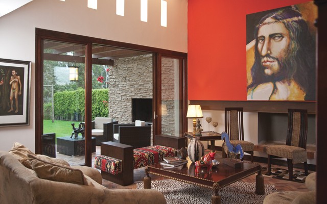 por eso, de nuestros viajes traemos piezas de escultura de diferentes lugares. Son tonterías que no cuestan mucho pero hacen una diferencia. Las pinturas son todas de artistas ecuatorianos y mi favorita es la pieza central de la sala, un Cristo de Luigi Stornaiolo, muy diferente a lo más conocido de él, porque es bondadoso, no muestra la fealdad, sino lo contrario.