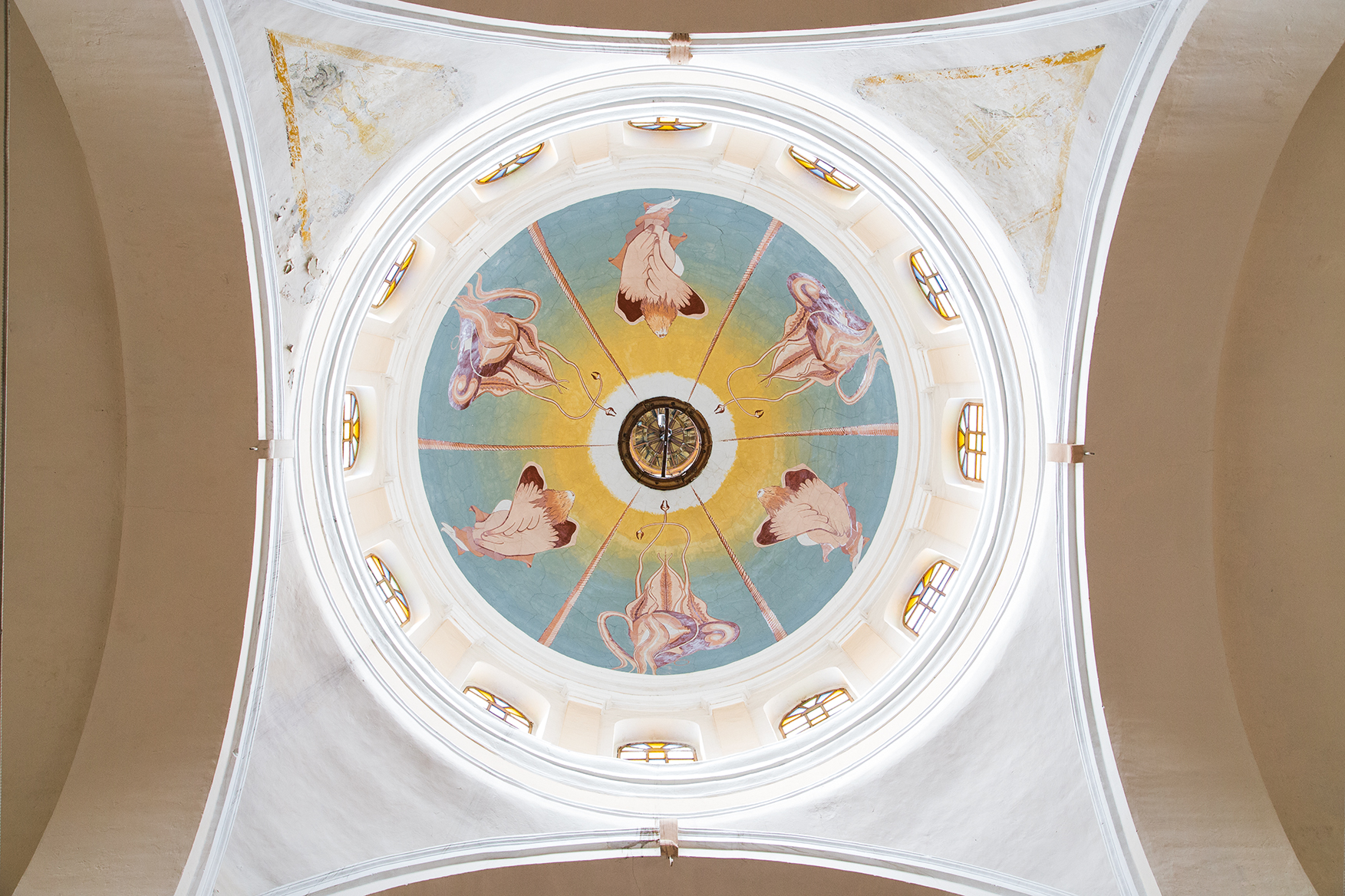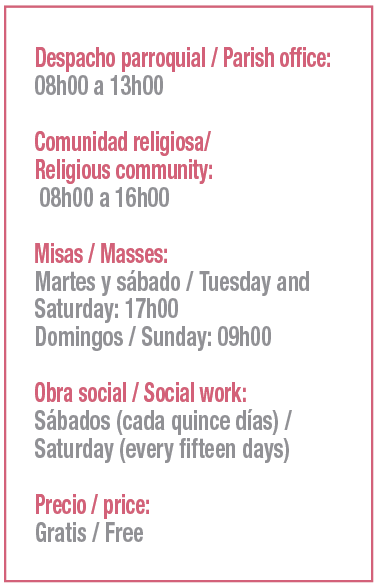 The wooden doors open into a plain and serious interior space, a striking contrast with the external edifice. The altars, as well as the altarpieces painted in pastel colors, are adorned with delicate floral designs and wood covered with gold leaf. Unlike other more opulent churches in the colonial downtown, this temple is markedly plain and humble. Few painting or sculptures are stored here. The oldest are a painting of the Virgin of the Rosary and a wooden bust of Saint Francis of Borja. This space is sought by seniors, neighbors and visitors for its peace, calm and security.