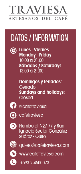 El café de esta tostaduría y cafetería nace del trabajo de productores locales. Traviesa escoge lo mejor del grano ecuatoriano y lo lleva a su mesa. En esa experiencia se expresa el respeto por un proceso que inicia con los agricultores de fincas grandes y pequeñas, que velan todos los días por mantener en su punto cada variedad de ese café que irradia la tierra.