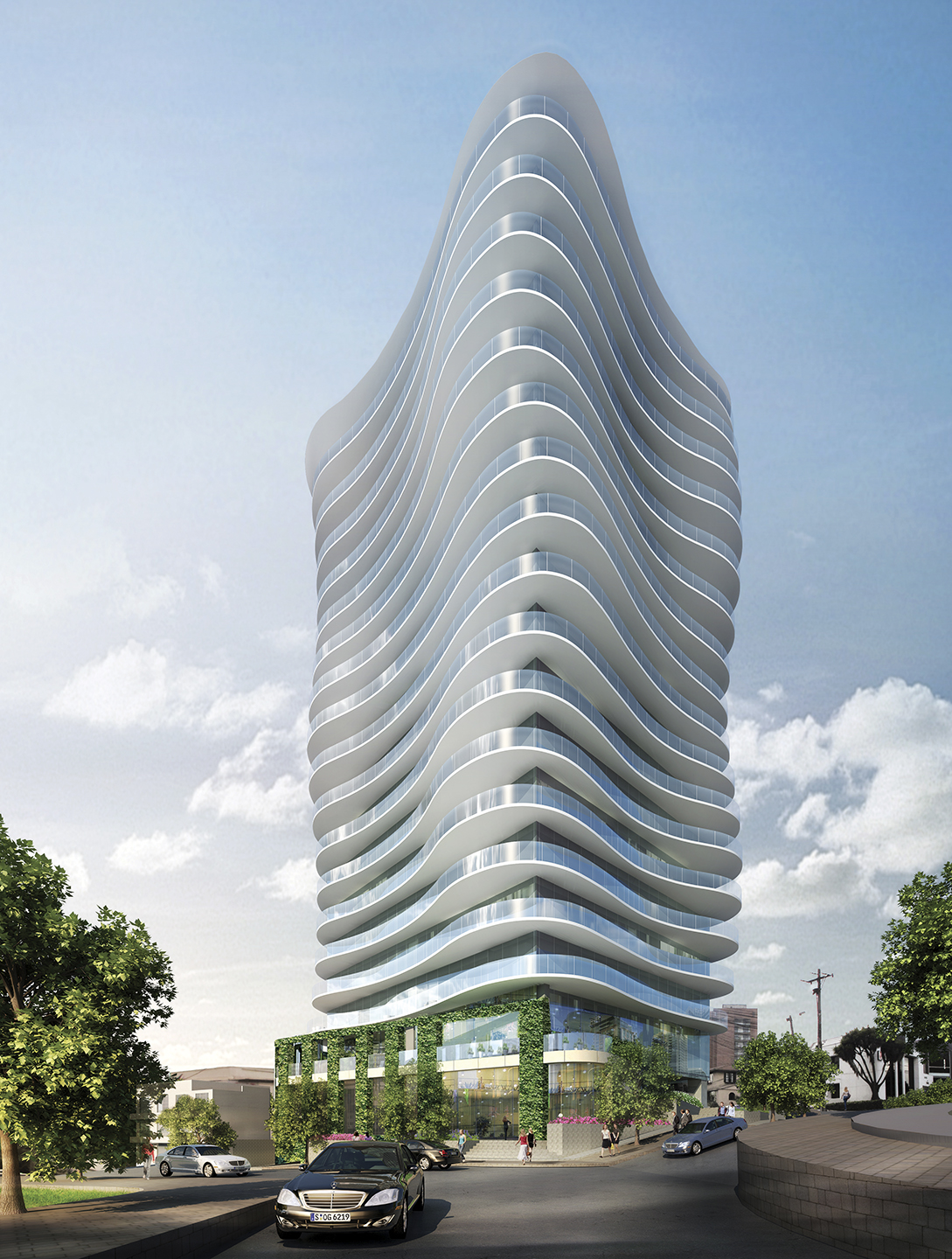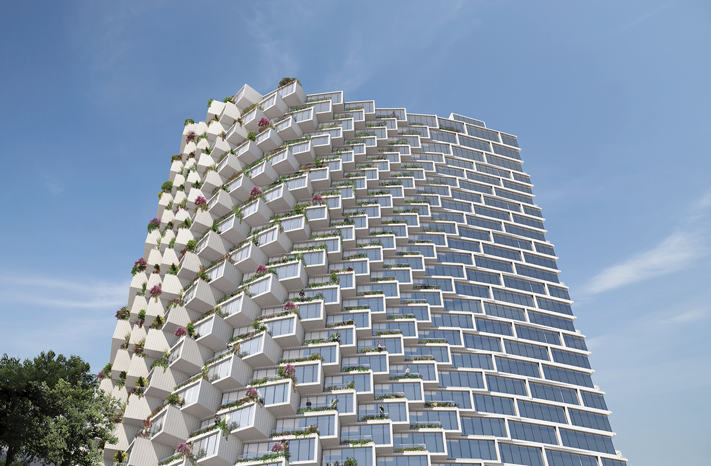 Cajas de hormigón apiladas en 32 pisos, cada una rota para proporcionar la mejor vista posible y crear terrazas al aire libre para cada apartamento. En la base del edificio hay una serie de escalones que forman una plaza abierta al público, que activa comercios y permite la circulación de público conectándolo también a los vestíbulos del proyecto. En el área de las terrazas escalonadas hay una piscina de entrenamiento integrada, que ofrece a los residentes un lugar para relajarse con vista a la ciudad.