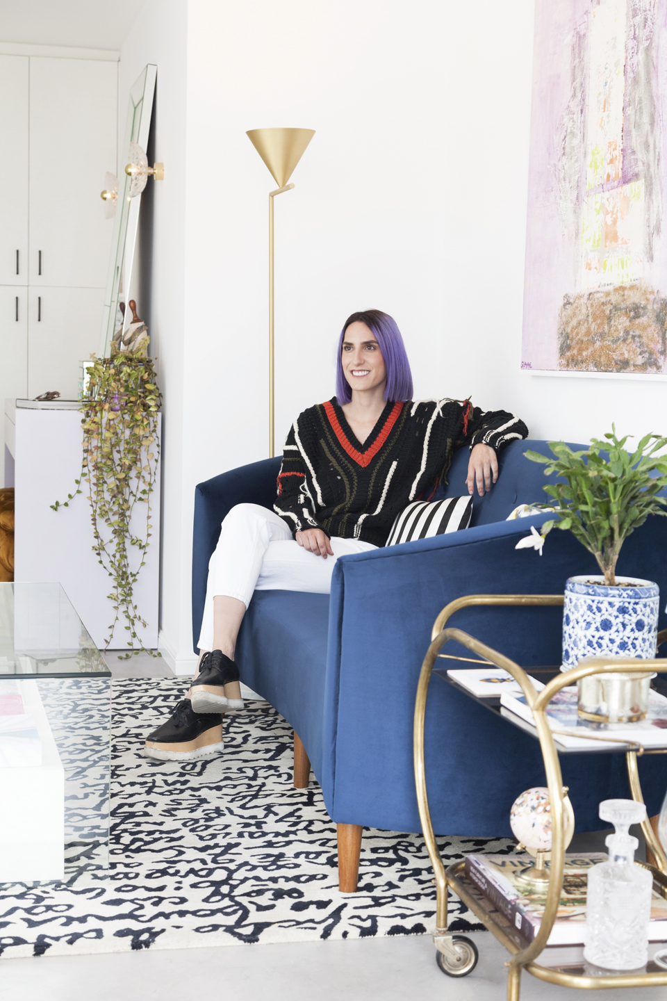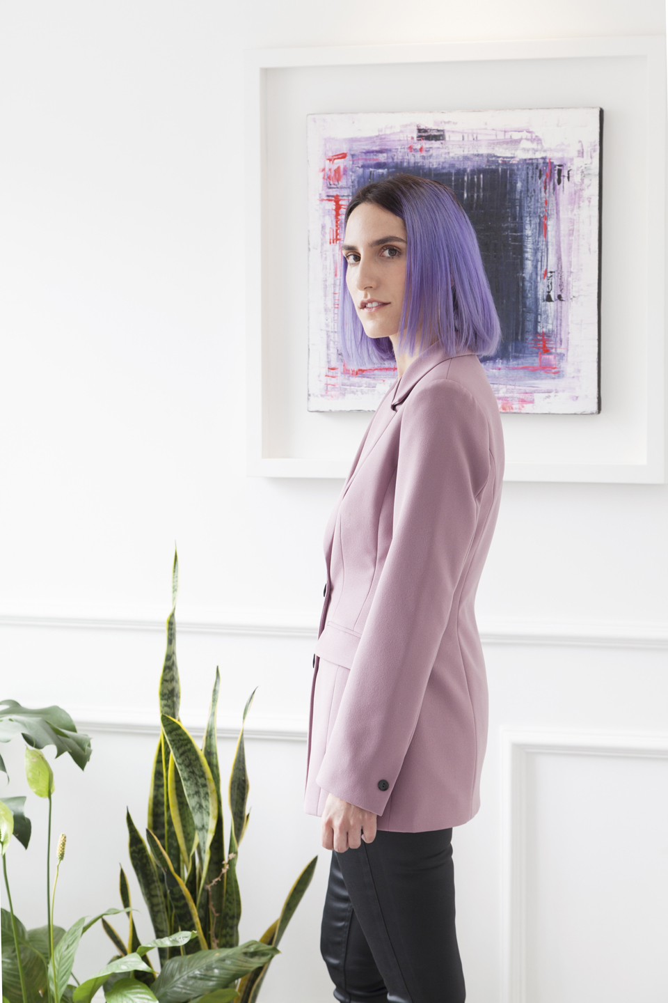Pero no fue solo el orden lo que me impactó. Fue la conjugación de colores, texturas y piezas decorativas idealmente armonizadas, no solo en la superficie de 50m2 de su suite, sino también en ella. Valentina es diseño puro, su pelo morado, el brillo en sus ojos y su manera de manejarse hablan de su talento y su libertad para crear.