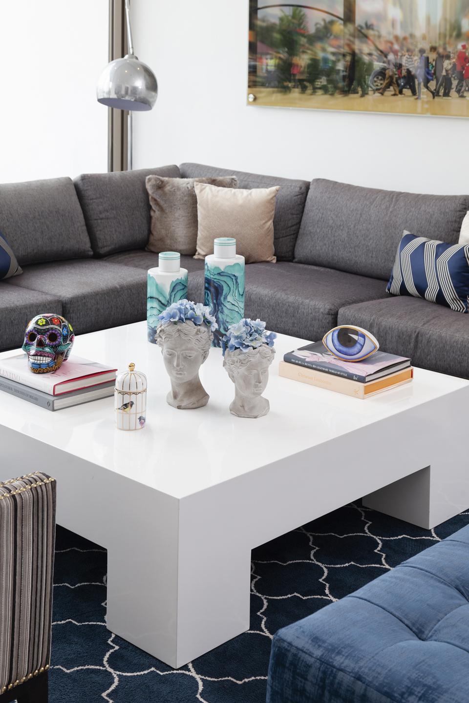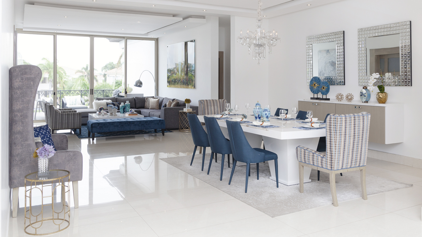 Todo lo que Valeria expresa lo evidenciamos en uno de sus proyectos. Un departamento en el que las líneas rectas predominan, donde no encontramos excesos de ningún tipo. Se trata de un espacio amplio, con luz natural que permite divisar el color que aportan los accesorios. El comedor tiene un claro protagonismo por una sencilla razón, sus propietarios lo comparten con familia y amigos de forma frecuente porque cocinan delicioso, información valiosa que obtuvo en ese compartir y conocerse previamente. Las distintas texturas utilizadas lo hacen acogedor. El terciopelo resalta en la misma dimensión que el azul, por algo se mantiene como el color del año, cuenta.