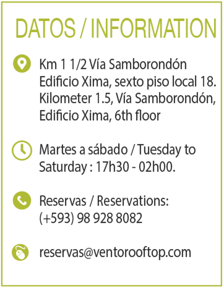 Vento Rooftop adquiere vida bajo el concepto de un lounge que “busca dar a sus clientes un ambiente distinto, con aires de internacionalidad”, según manifiesta Luis Adrián Morejón, uno de los socios. El rooftop se localiza en el sexto piso de un edificio, aportando a sus comensales la experiencia de una vista única y de un lugar exclusivo.