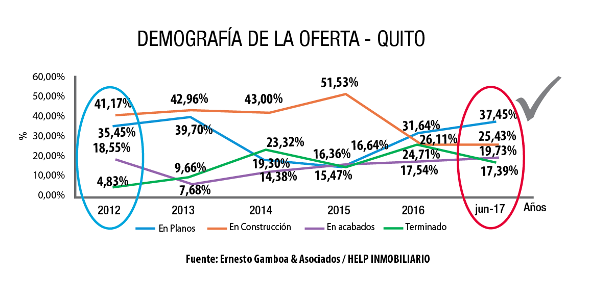 En épocas de problemas, cuando las absorciones bajan y disminuye la rotación, el inventario tiende a envejecerse y comienza a aumentar el volumen de proyectos en etapa de terminado. Para el año 2015, la proporción de proyectos en planos bajó a un punto crítico, solo el 16,36 % de la oferta estuvo en esta etapa (ver gráfica demografía de la oferta – Quito). Sin embargo, este indicador mejora y refleja un 37,45 % de proyectos en planos en junio de 2017.