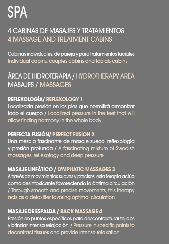 To complement your experience in a place where you will be pampered upon arrival you can enjoy the outdoor areas, the resort style pool, whirlpool, children’s pool and cold pool; and interior areas where you can enjoy the Turkish bath, sauna, internal whirlpool and relaxation rooms, as well as the complete gym. It is a wonderful adventure for any day of the year.